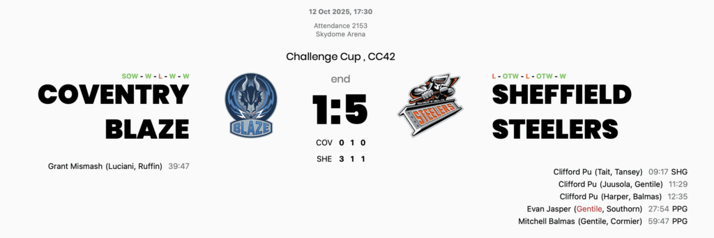 Road wins for both sides in the Challenge Cup with the Steelers being shut out at the arena on the 27th September following goals from Hazledine and Tallgerg, two weeks later the Steelers reversed that result with a 5-1 road win, Cliff Pu had a first period hat trick with Evan Jasper and Mitchell Balmas rounding off the scoring