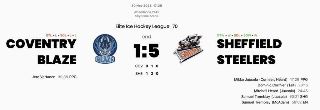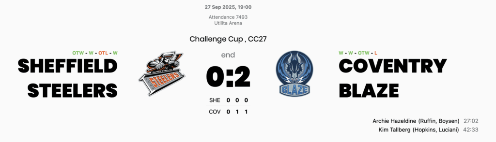In league play the Steelers have notched up two road wins whilst tonight is the first of the three home games will play against Coventry this season.