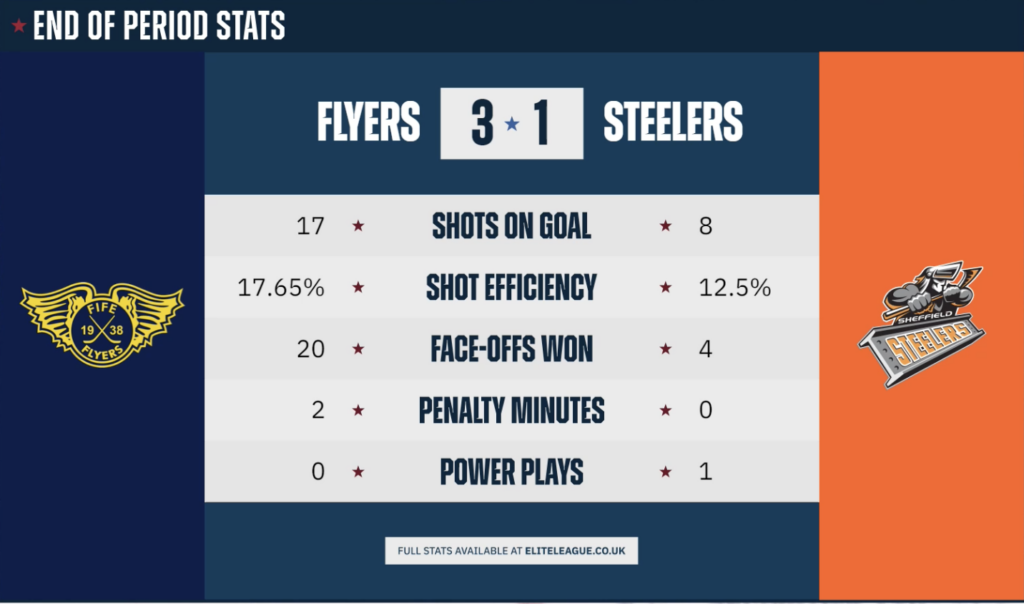 39.39 and the Flyers score a 5th, again failing to clear the trouble in front of McAdam with Porsberger pouncing first this time to hit the net and give Fife a 3 goal advantage as the period ends.