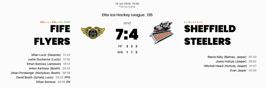 Steelers pulled McAdam searching for a 5th but the Flyers intercepted and Somoza scored his second hitting the empty net for a 7-4 scoreline