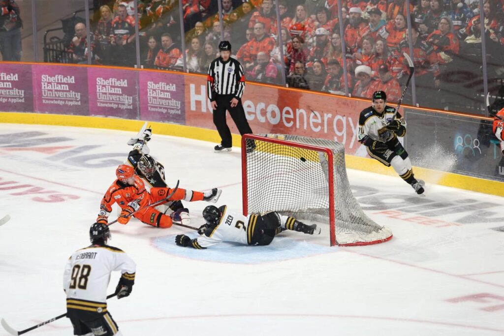 Just 36 seconds later, the Utilita Arena erupted again. Dowd drove hard around his marker and forced a save from Carr, but the rebound spilled into the crease where Mikko Juusola reacted quickest, burying the puck to give the Steelers their first lead of the night at 3–2. The Panthers pushed hard in response, peppering the Sheffield net as the clock wound down, and their pressure told at 56:53 when David Noel struck again, ripping a shot top corner from the high slot to make it 3–3.