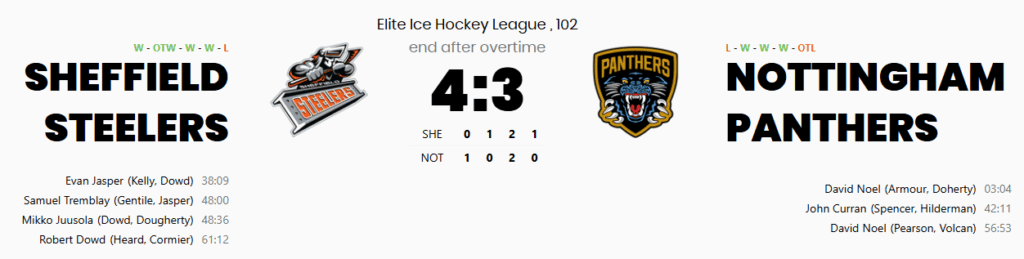 Statistically, the game was finely balanced. Nottingham finished with a slight edge in shots on goal (38–34), but the Steelers were clinical when it mattered, finishing with a higher shooting efficiency and winning the faceoff battle. Sheffield’s penalty kill was flawless, killing off both Panthers power plays, while Greenfield stood tall with a .921 save percentage. Ultimately, it was captain Robert Dowd who delivered the decisive moment, sealing the extra point in overtime and lifting the Steelers to the top of the Elite League standings.