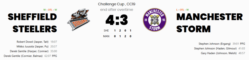 The extra frame delivered high drama. Jasper almost won it with a wraparound that appeared to sneak over the line, only for officials to review and confirm no goal. Undeterred, the Steelers pressed on and their persistence paid off at 62:07. Dominic Cormier created the opening and fed Gentile, who unleashed a rocket one-timer past Deridder to seal the victory. The roof lifted off the Utilita Arena as the Steelers claimed the two Challenge Cup points with a 4–3 [OT] triumph.