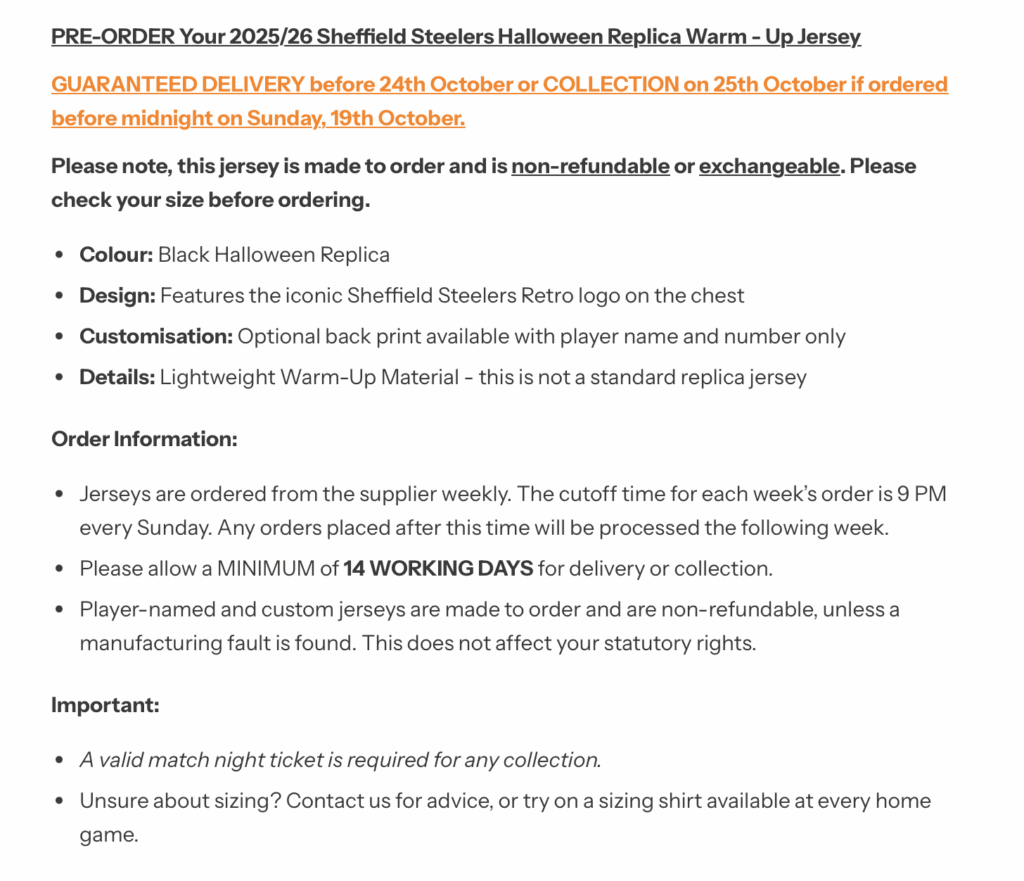 The final time they will be worn is for the home game against Belfast Giants on Saturday 1st November and it will be on that day, that the club will hold a full team raffle for the game worn versions.