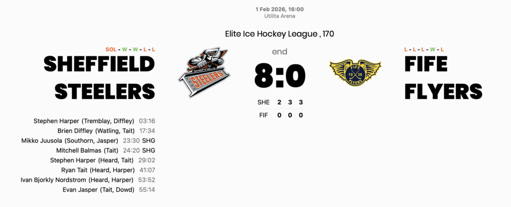 This was a statement win from the Sheffield Steelers. Their speed, structure, and lethal special teams completely overwhelmed the Fife Flyers, who were punished mercilessly for mistakes and never found a foothold in the game.