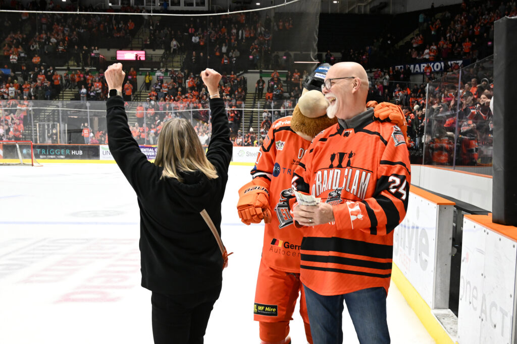 Kevin Tansey and Steeler Dan presented the prize on the ice after the game (Kevin is on the left as you look)
