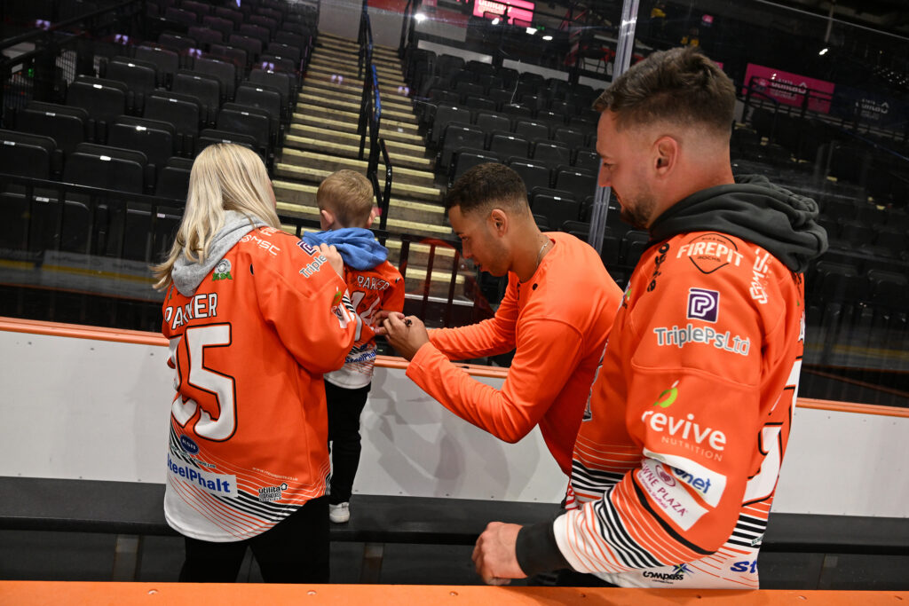 Stephen Harper signed a programme earlier in the day and the lucky people who bought that magazine were Chris, Zoey and Ethan Parker – after the game they headed down to meet Stephen for these pictures on the team bench.