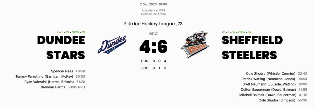 Final score: Dundee Stars 4-6 Sheffield Steelers.