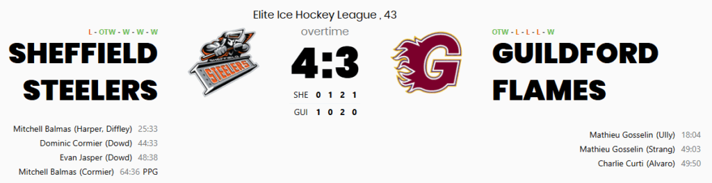 Mathieu Gosselin took the Flames’ Man of the Match honours for his two-goal performance, while Dominic Cormier was named Man of the Match for Sheffield after a commanding two-way display capped by his highlight-reel strike.