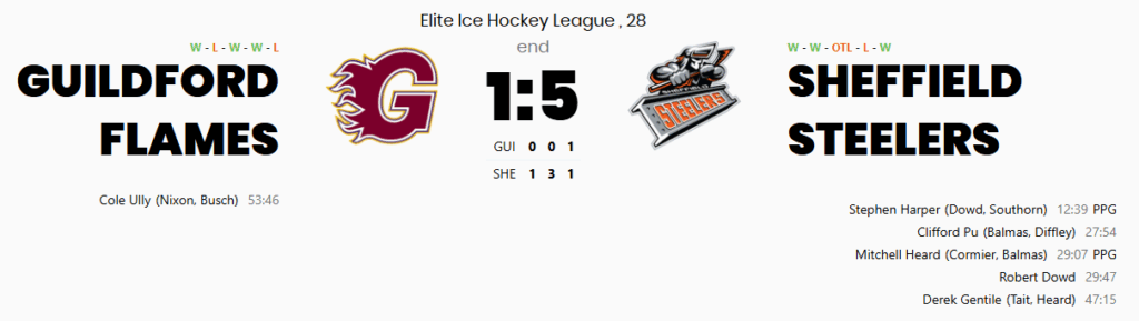 The Sheffield Steelers made it three wins in a row and continued their impressive form on the road with a dominant 5–1 victory over the Guildford Flames at The Spectrum. Coming off 4-point weekend including and a somewhat chaotic Challenge Cup finish against the Manchester Storm, the Steelers showed no signs of fatigue as they put in one of their most complete performances of the season.