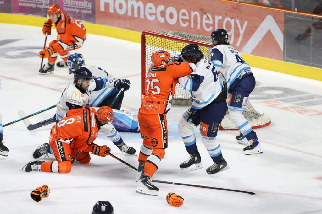 Sheffield’s carry-over powerplay was quickly dealt with by Coventry, and early in the period Stephen Harper found Cliff Pu at the net-front for a redirect that Robson smothered with his chest. Tempers flared again soon after when Greenfield was tripped behind his own net by Alessio Luciani. Joona Huttula stepped in to defend his goaltender, and both players were handed minors.
