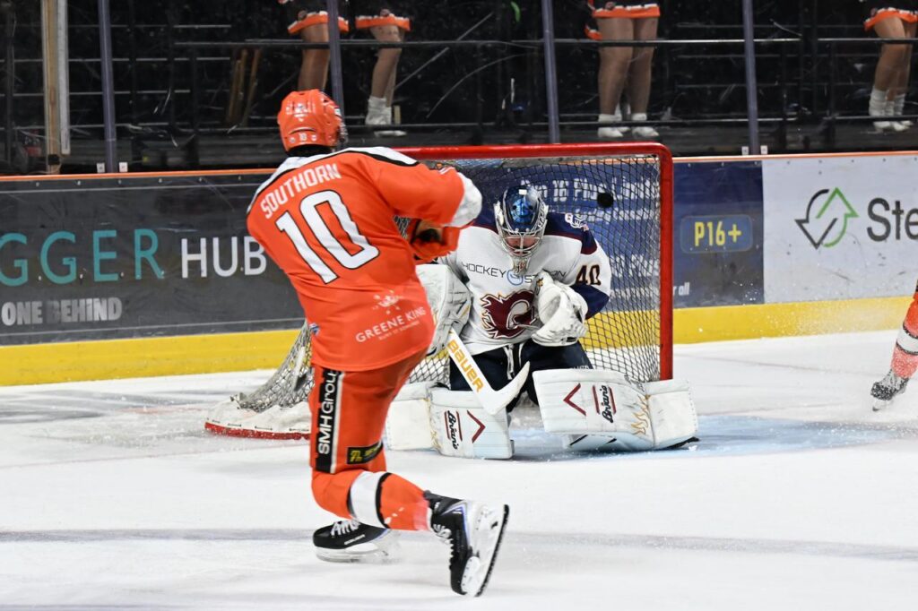 The Flames had moments of threat, notably striking the crossbar during a rare surge, but the Steelers quickly reasserted control. Their third goal came at 30:53 and was a highlight of the night. Jordon Southorn picked up a perfectly weighted pass from Ryan Tait and rifled a shot top shelf from the left wing, leaving Fazio with no chance. The goal further energised the crowd and put the Steelers firmly in command of the tie.