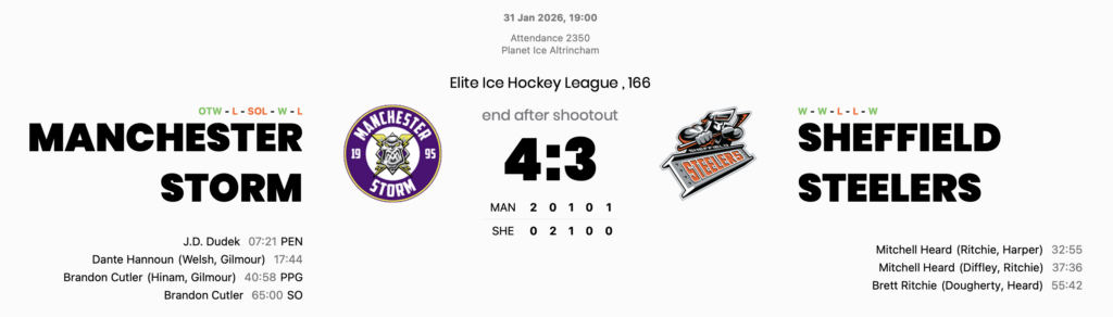 Sheffield had trailed 2-0 after the opening period but Mitchel Heard’s brace levelled the game at the end of the middle session. Storm scored on the PP at the start of the final period but Brett Ritchie tied the game late on.