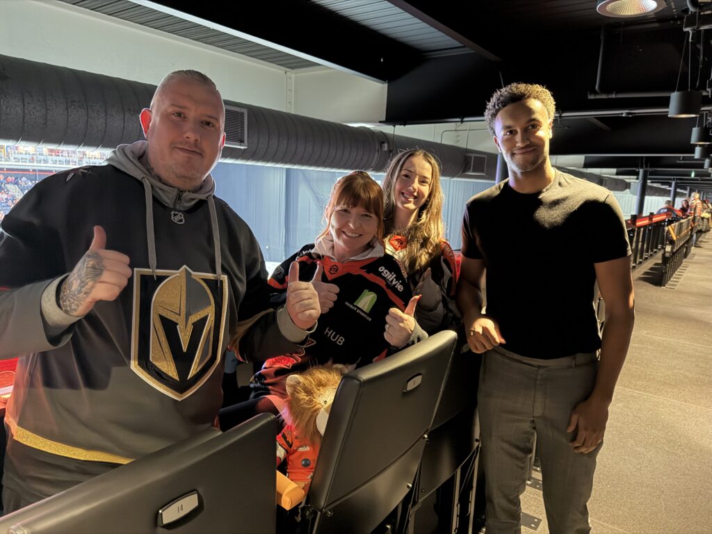Curtis Warburton wanted a bit of the whole Sky’s Edge feel so in the second period break he popped over to the penalty box side of the arena and met and mingled with the great and the good.